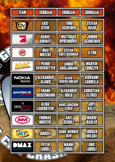 Insgesamt 30 Crash-Piloten treten in zehn Teams und drei Rennklassen (3000, 1900 und 1500 ccm Hubraum) gegeneinander an. An den Start gehen dabei Ex-Boxschwergewicht Axel Schulz, Renn-Fuchs Hans-Joachim `Striezel` Stuck, Elton, Schauspieler Axel Stein, Sänger Giovanni Zarella, Sport-Kommentator Frank Buschmann, TV-Moderatorin Alida-Nadine Lauenstein und der amtierende Stock-Car-Champion Christian Clerici. Natürlich steigt auch der Initiator selbst ins Cockpit: Unser Meister aller Klassen möchte seinen Titel in der Königsklasse über 3000 ccm zurückerobern, den ihm Christian Clerici im vergangenen Jahrabgeluchst hatte.