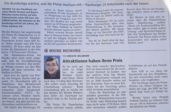 heute morgen habe ich in die Nordsee Zeitung geschaut und gesehen, dass Werder Bremen ab der kommenden Saison die Ticketpreise anhebt. Ich denke mal, dass einige Fans die Preise akzeptieren werden und einige eben nicht. Man wird mit der Zeit sehen, wie die Preise angenommen werden.