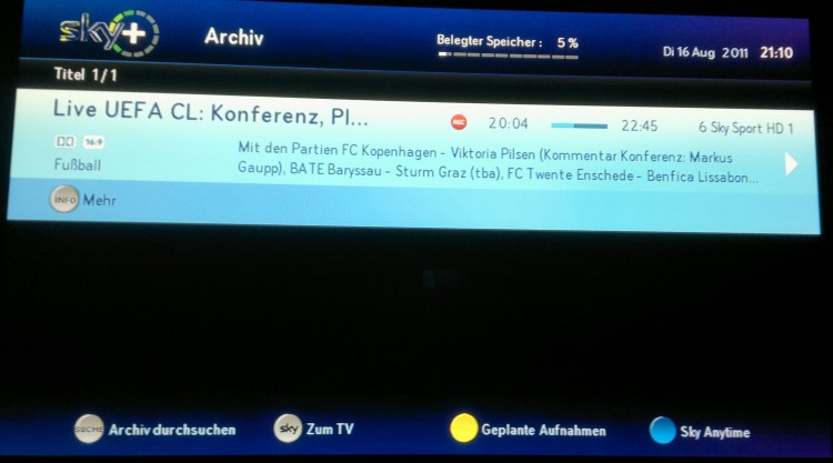 Sky Infopolitik: Die Infopolitik von Sky ist wie immer grottenschlecht. Die PM mal ausgenommen, gibt es auf der Homepage weder Infos zum Start der Software, zum Start von Anytime, eine Übersicht über neue Funktionen, eine neue Bedienungsanleitung. Ich gehe mal davon aus das Sky bei den meisten Sky+ Benutzern eine E-Mail Adresse im System hat, die hätte man auch für Infos verwenden können.