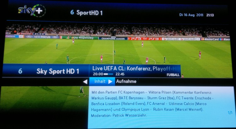 Es sind zwar keine perfekten Bilder, die ich von der neuen Software auf dem Sky+ Receiver machen konnte, aber es gibt dennoch einen ersten Eindruck von den Veränderungen. Vor allem die Farbe ist neu – In einem in blau getauchten Design kommt der Guide frisch gestrichen daher.