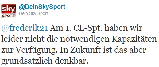 Zeigt Sky in der Zukunft eine „deutsche Konferenz“ in der Champions League? Das würde sich anbieten, da Borussia Dortmund am gleichen Tag auf den FC Arsenal trifft, wie eben Bayer Leverkusen auf den FC Chelsea. Frederik vom „Kommentatoren-Blog“ fragte auf Twitter mal nach.