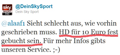 … denn so richtig weiß niemand, was man nun für „Premium HD“ benötigt, bzw. ob ein Abo mit Sky Welt + 1. Premium Paket + HD reicht oder ob nur Sky Welt + einer HD-Freischaltung benötigt wird oder ob man mit einem rabbatierten Abo Sky Go überhaupt nicht freigeschaltet bekommt. Denn auf Twitter /@Dein Sky Sport) schrieb Sky: