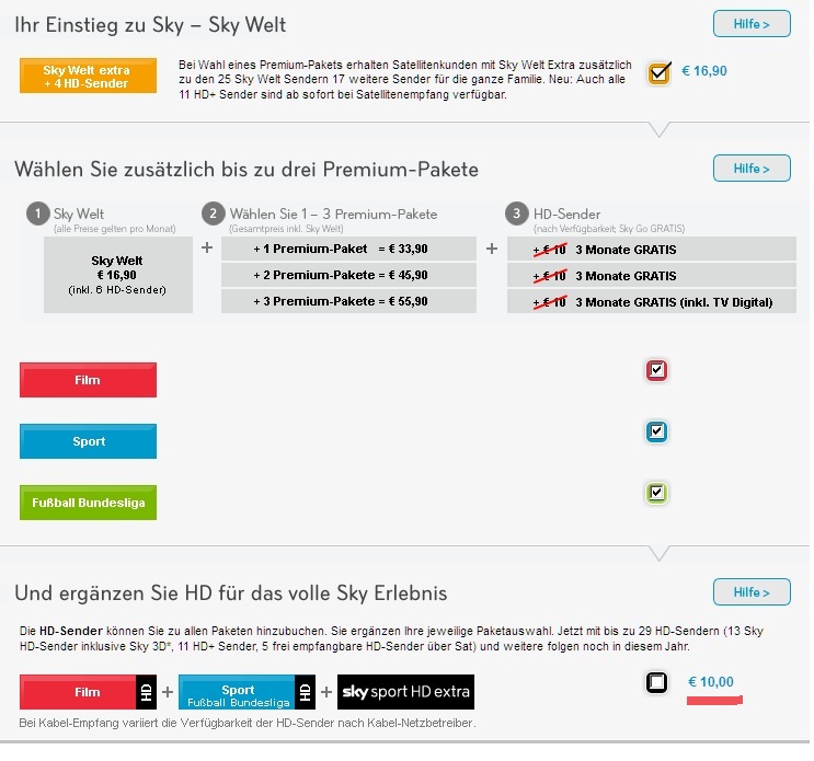 Jetzt wissen wir, wieso Sky diese 10,00 Euro als festen Betrag für das HD-Paket bestimmt hat. Denn Sky HD kostet bei drei Paketen nicht mehr 4,00 Euro, sondern jetzt 10,00 Euro!