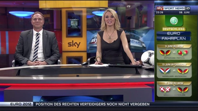 Zu Gast in der gestrigen Sendung war Sky-Kommentator Kai Dittmann, der sehr locker und sympathisch seine Einschätzungen zu den beiden Auftaktspielen der Euro 2012 gab. Durch die Sendung führte, wie bereits am Donnerstag, Britta Hofmann, die ab der kommenden Bundesliga-Saison auch als Fieldreporterin für „Sky Sport“ arbeiten wird. Man verzichtet beim Euro-Spezial komplett auf einen zweiten Anchor und legt eher Wert auf den persönlichen Austausch mit dem Gast im Studio. Gestern Dittmann, am Donnerstag Andreas Hinkel. So wirkt die ganze Sendung eben nicht wie eine News-Schiene, sondern wie eine amüsante, aber eben auch informative Nachlese der gesehenen EM-Partien.