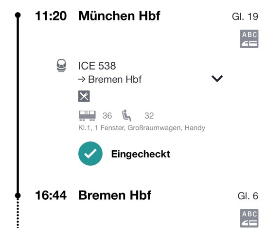 Ganz neu ist ein „Check In“-Vorgang, nachdem man den Zug betreten hat. Über die DB-App kann man nun kurz vorher einchecken und wird danach nicht mehr kontrolliert. Dies hat übrigens auch problemlos funktioniert.