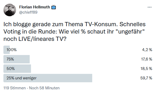 Während ich diese Zeilen schrieb, habe ich auf Twitter ein Voting gestellt. Es geht darum, wie viel Prozent meiner Timeline noch „linear“ schaut. Das Ergebnis ist wenig überraschend. Fast 60% gucken nur noch „bis zu 25%“ live. Und der absolute Großteil davon ist und bleibt der Sport.