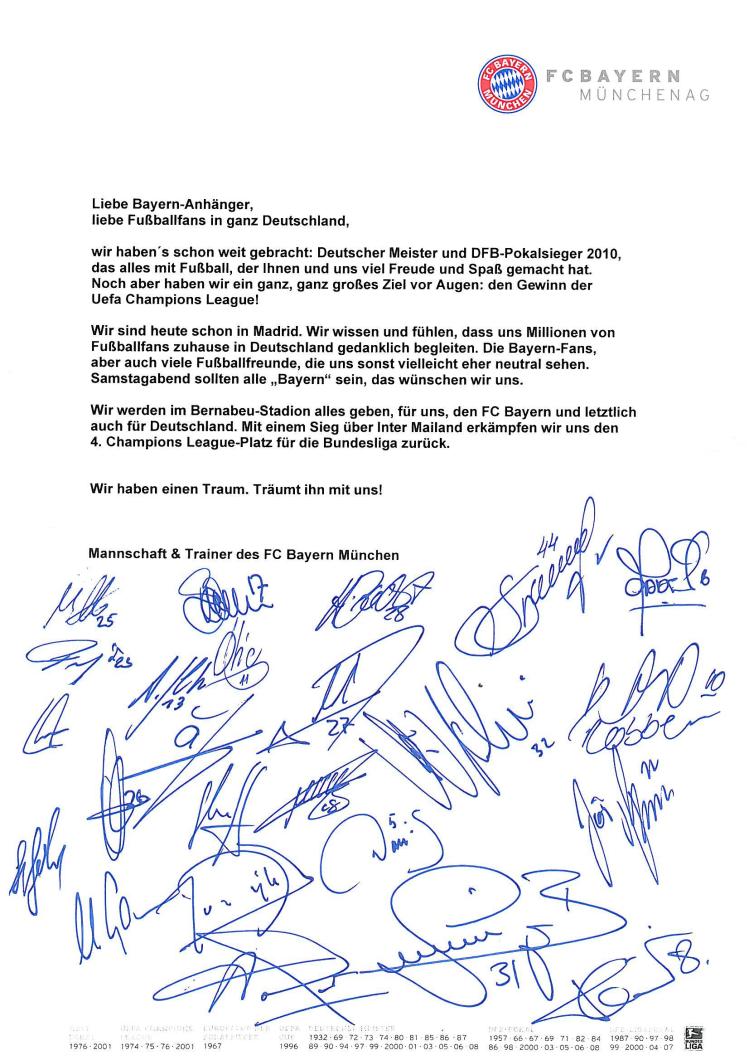 Eine wie ich finde tolle Aktion haben die Bayern nun vor dem Finale veröffentlicht. Es gibt einen Brief mit einigen Worten zu diesem Finale. Neben Worten, haben auch alle Spieler, sowie van Gaal unterschrieben.